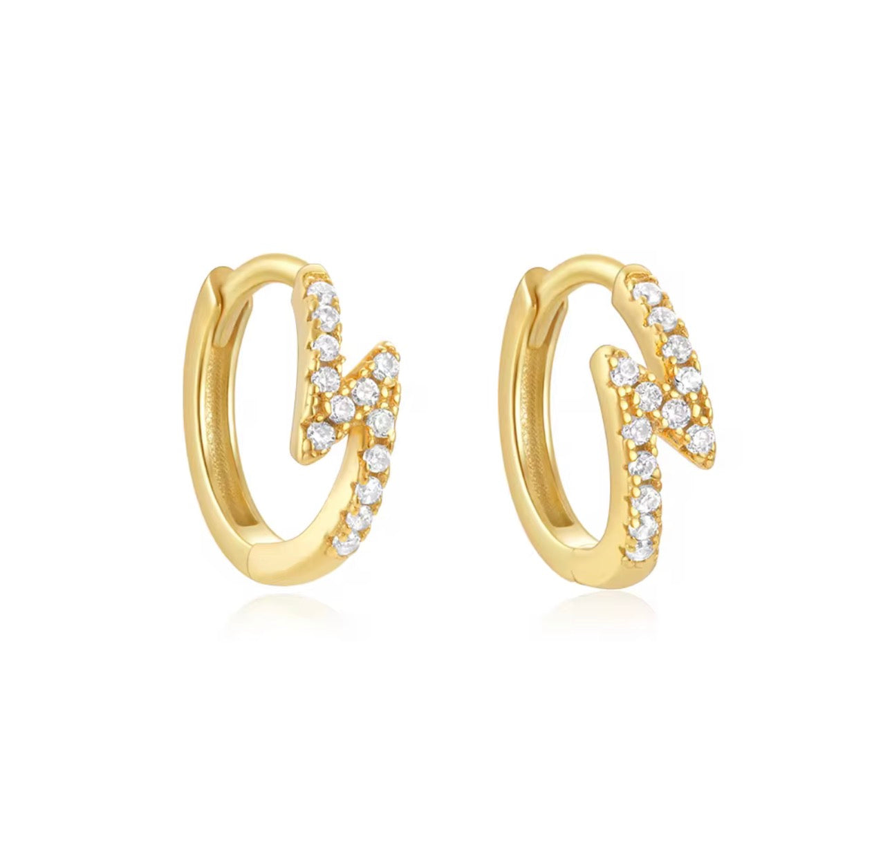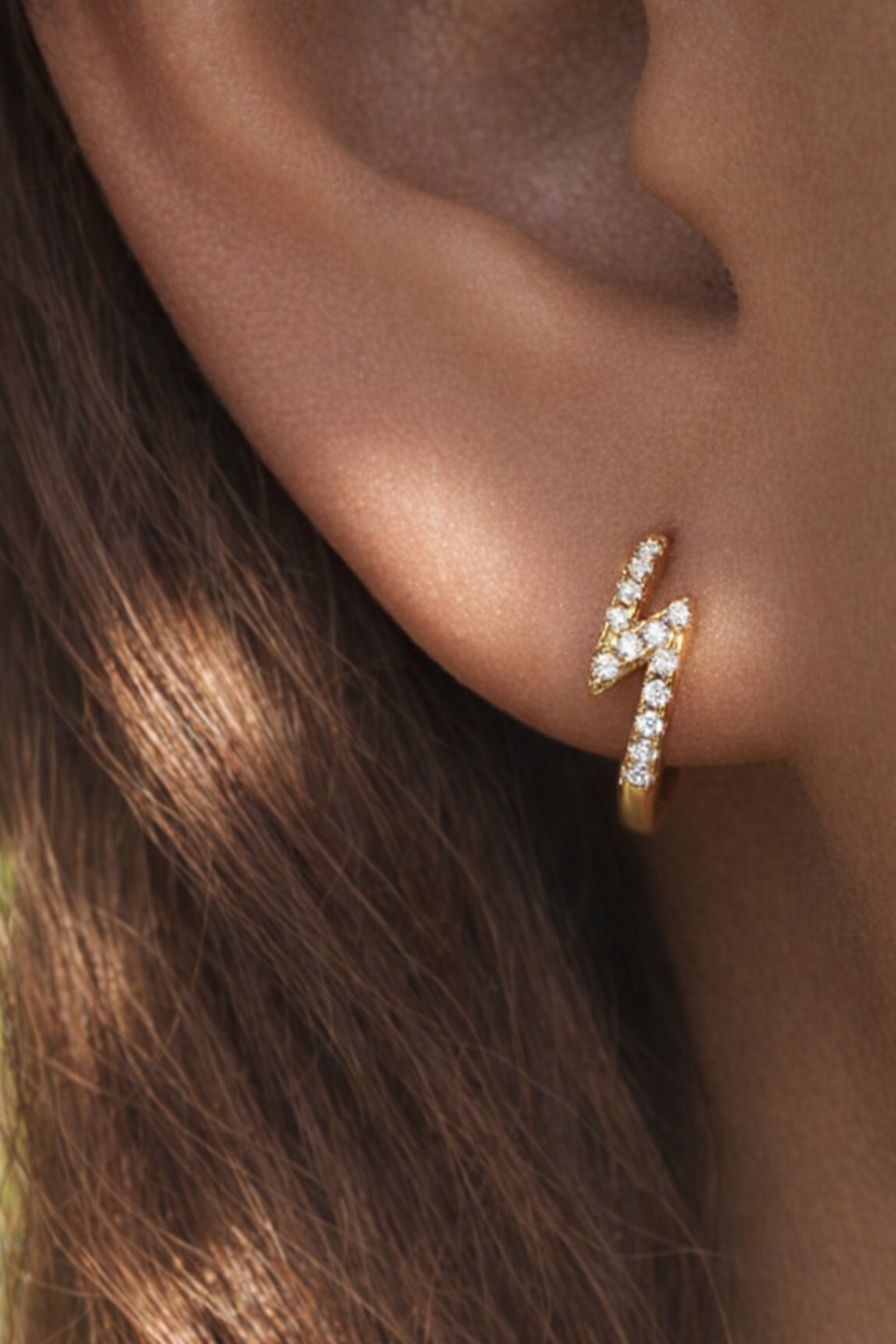 Elevate your everyday look with these striking Storm Pave Huggies in gold. Featuring a dazzling pave lightning bolt design, these huggie hoops combine bold symbolism with refined sparkle. The secure hug-style fit keeps them comfortably in place throughout your day, while the intricate pave detailing catches light beautifully. Perfect for adding an edgy-glam touch to any outfit, from casual to dressed-up occasions.